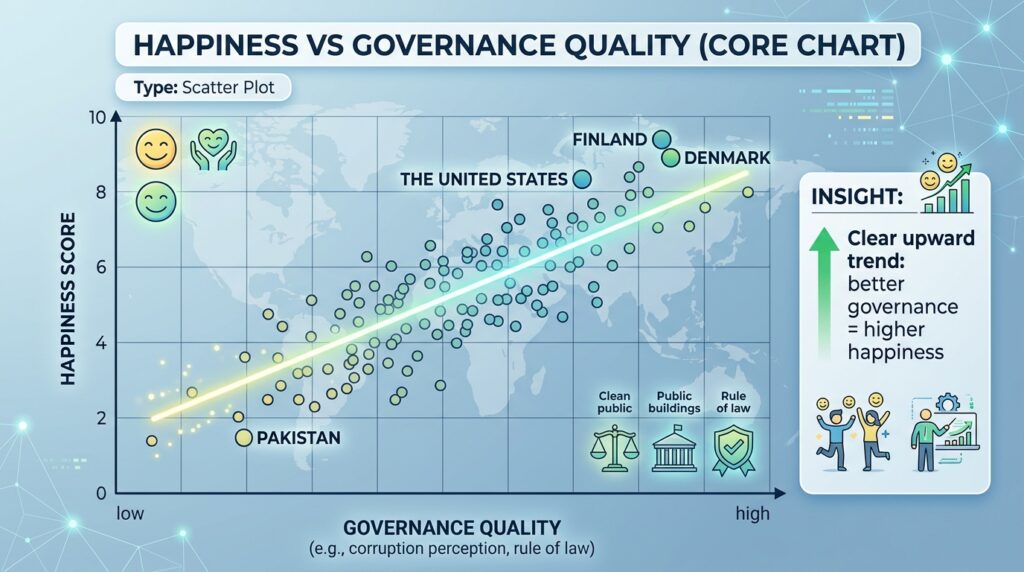 The pattern is striking: Finland and Denmark sit at the top-right quadrant, with high governance and happiness scores, while Pakistan scores lower on both. Improved governance reduces uncertainty and directly boosts citizen well-being.